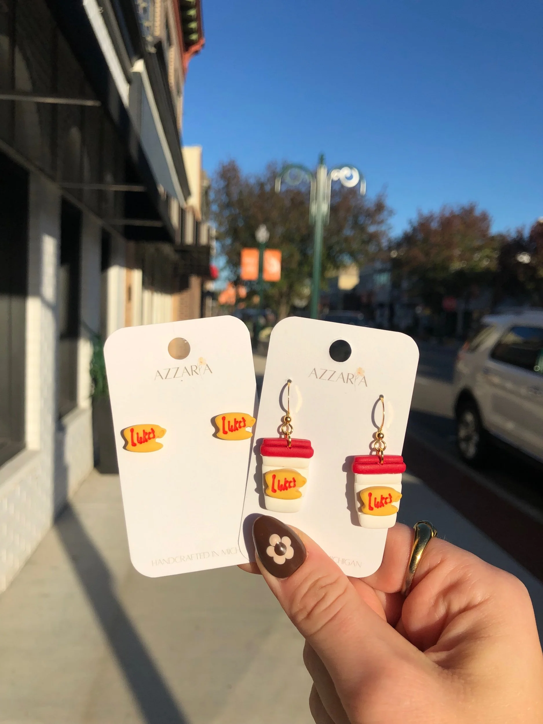 Gilmore Girl’s themed earrings starring the iconic Luke’s Diner logo. Available as studs and dangle takeout cups.