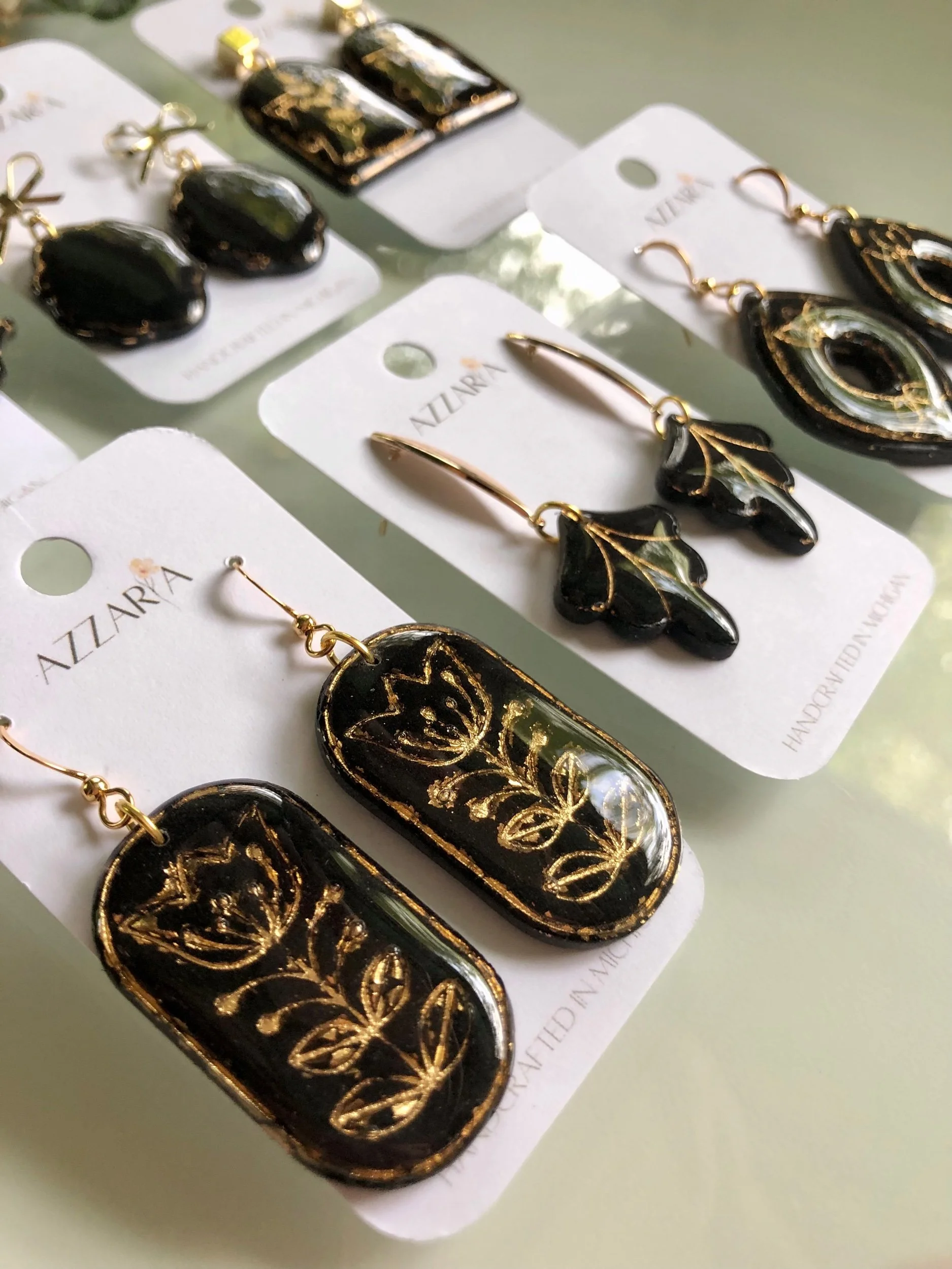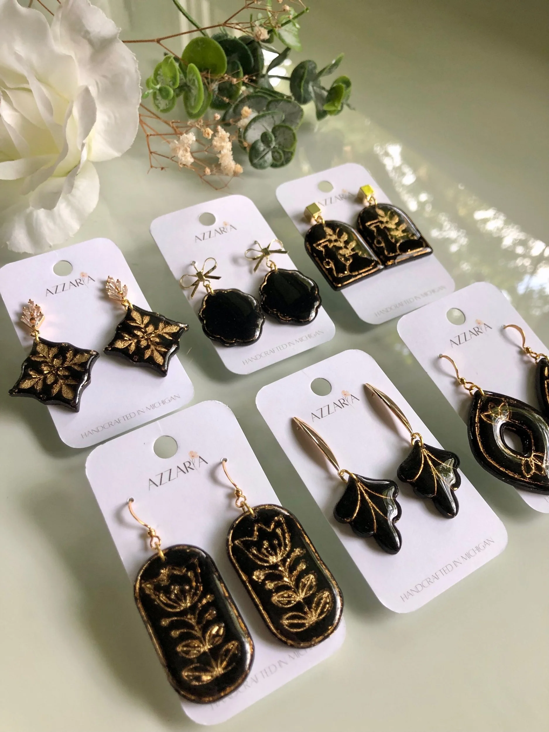 Polymer clay is an incredibly lightweight material, making it ideal for statement jewelry, but it is still clay. For longevity of the pieces, they need to be treated with care. Avoid sleeping, showering, and exercising with them on, and avoid contact with chemicals, perfumes, and oils. Though the clay has a bit of flexibility, do not bend, as excessive bending can cause breakage. To clean, gently wipe with a damp cloth and set out to dry. Warning: excessive rubbing may remove paint and details.