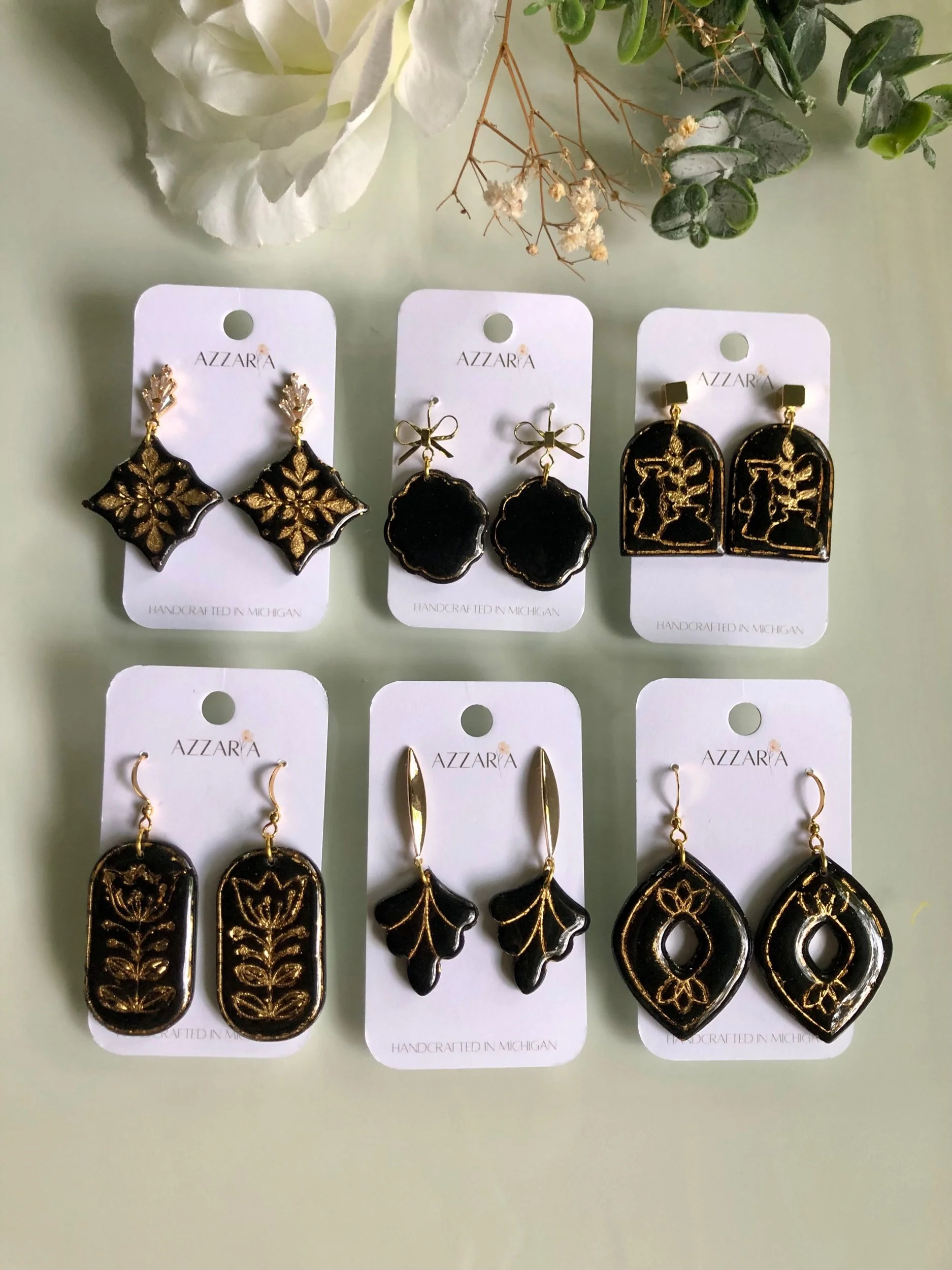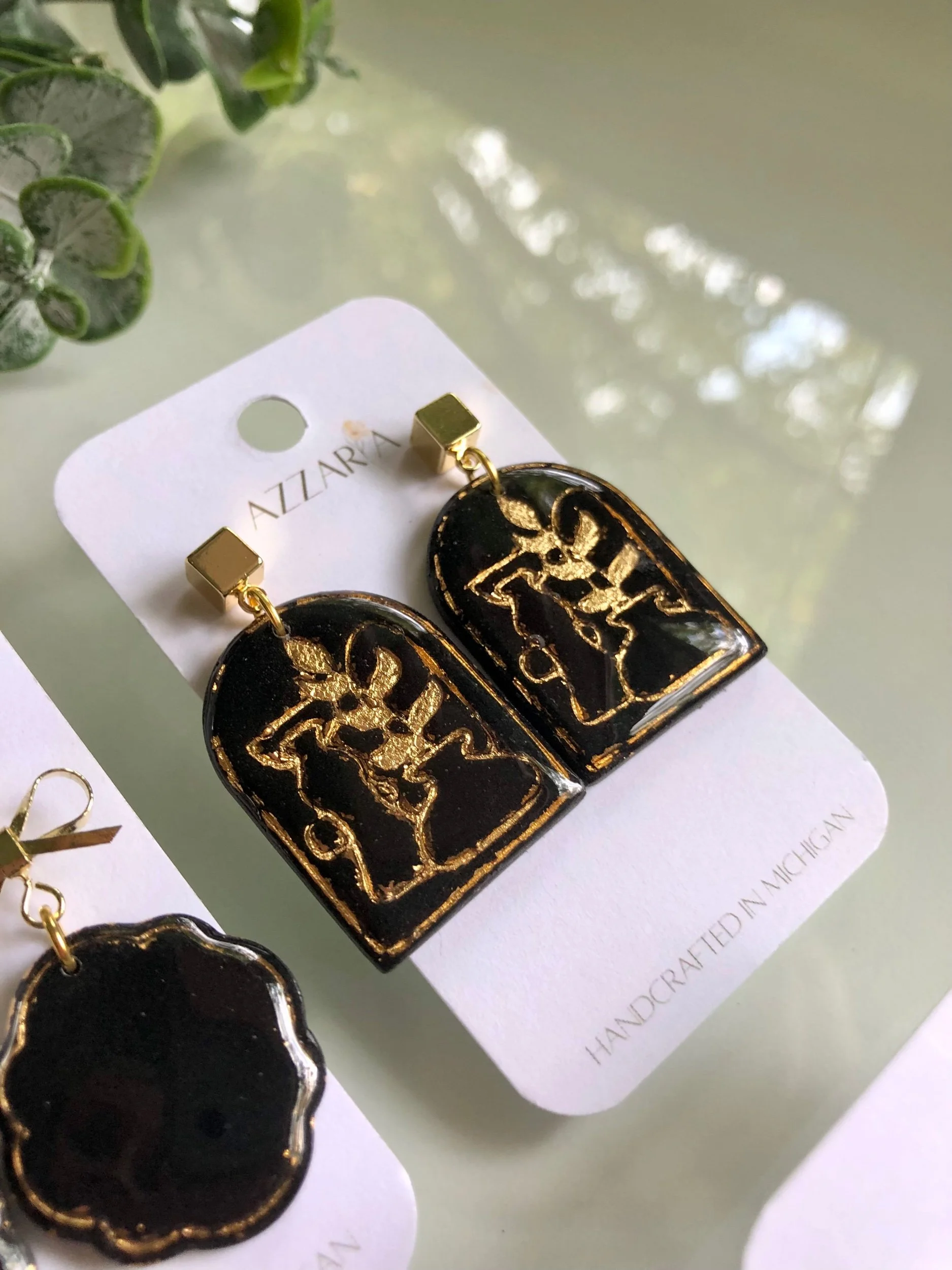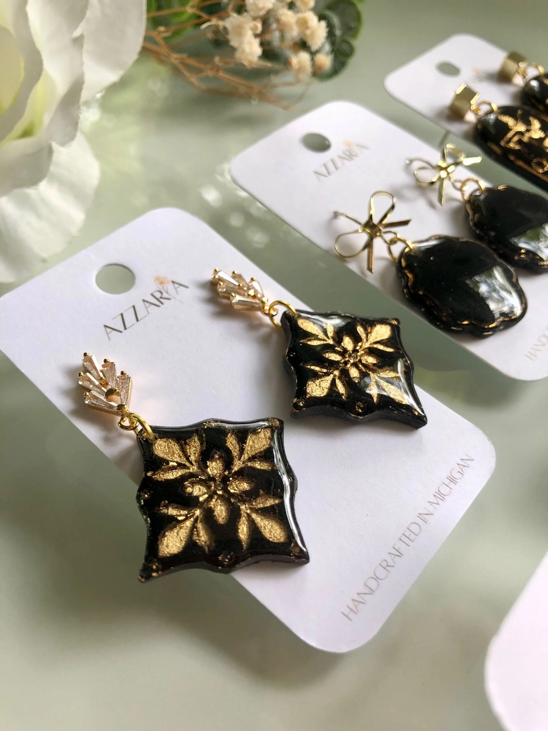 Elegant statement earrings with gold leaf grouting and details. Coated with resin for a beautiful shine.